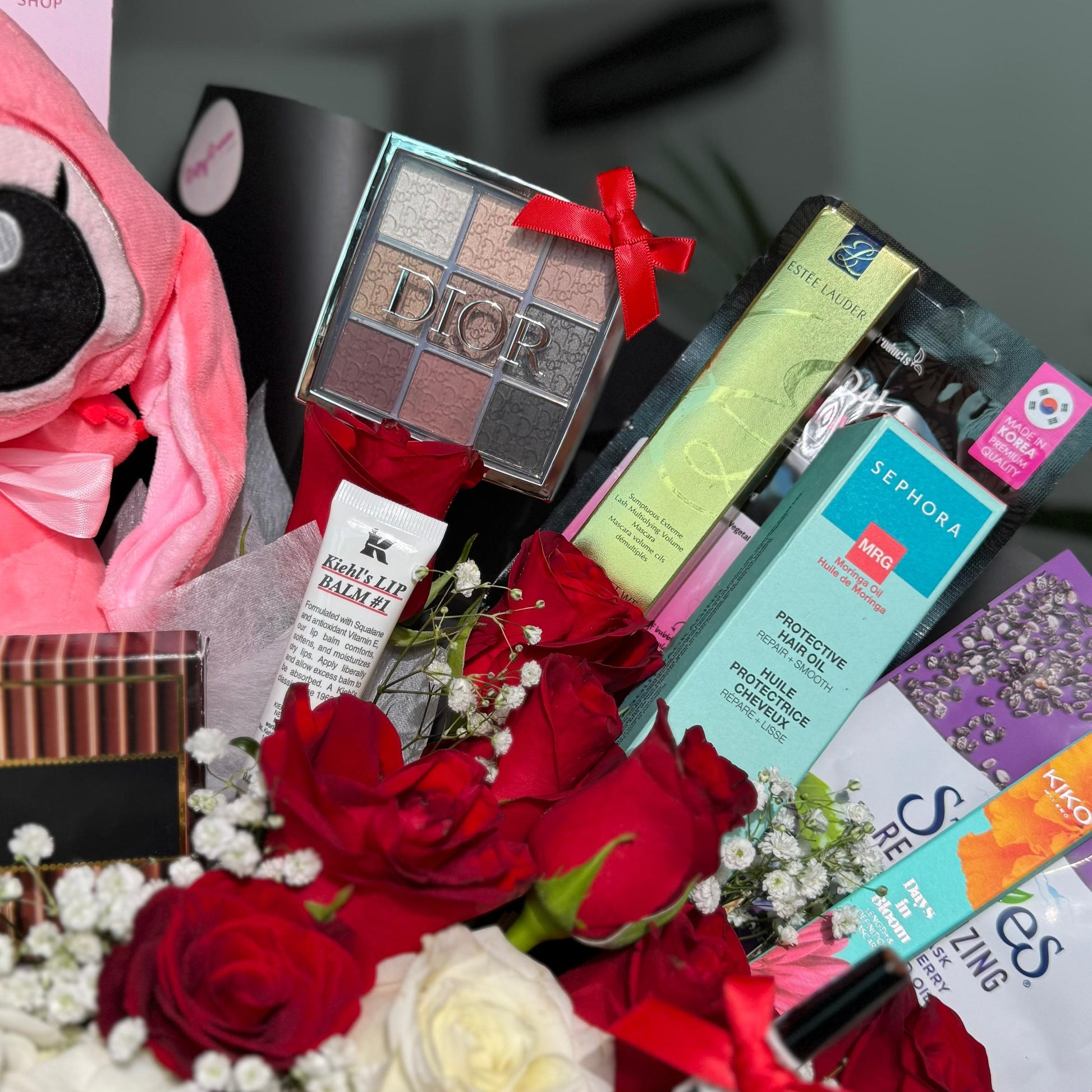 باقة فاخرة لا مثيل لها تضم ماركات مكياج فاخرة، وورود وردية طازجة، ودمية ستيتش. نسخة ناعمة وأنيقة من باقتنا الأيقونية، مصممة خصيصًا للاحتفالات التي لا تُنسى.
