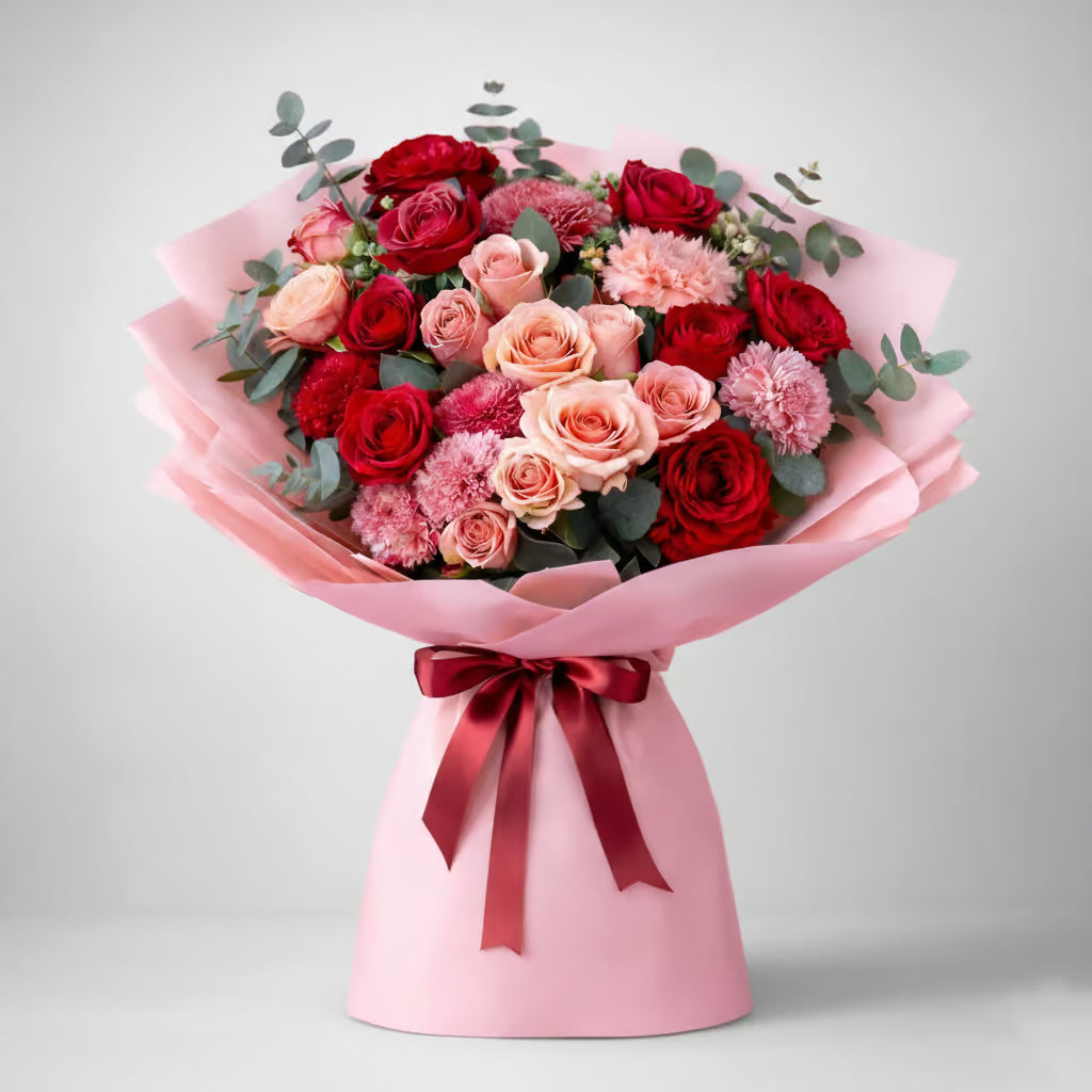 Passion pirouettes with tenderness in this symphony of blush and crimson, where roses in varying hues create a conversation about love's many dimensions. This romantic bouquet Dubai offering captures the complexity of devotion, blending fiery reds with soft pinks in an arrangement that feels both bold and whisper gentle.
